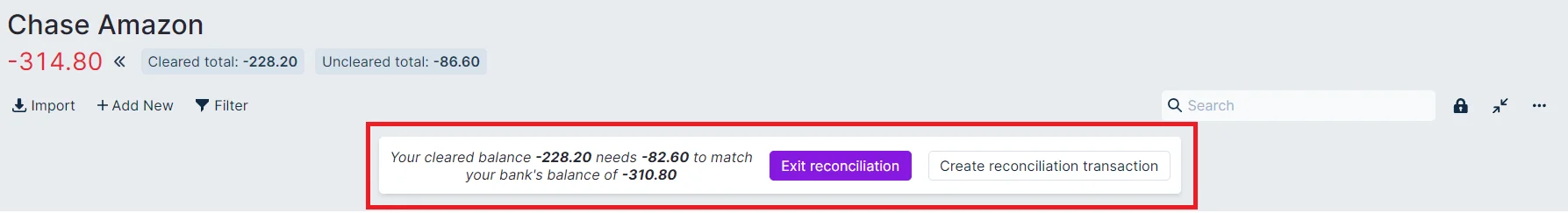 Let's imagine that you checked your account balance for Chase Amazon and the current balance is -310.80. The tool will default to the Cleared total. Enter the balance you want to match into the Reconciliation tool and click Reconcile.