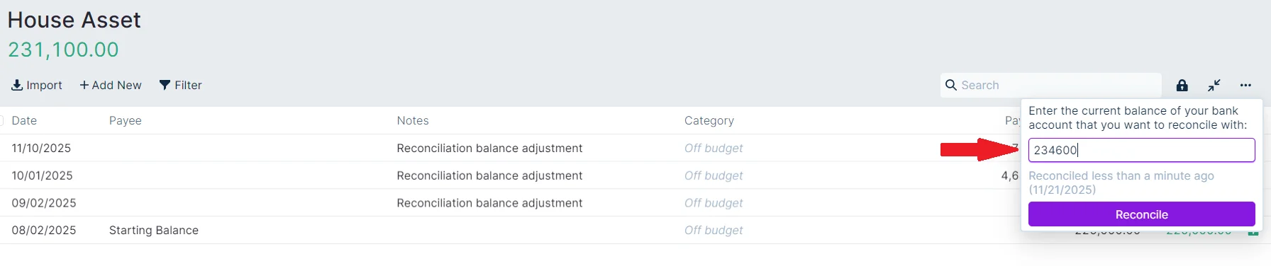 For example, on 10-Nov-2025, my house was valued at 231,100 then some houses sold in my neighborhood and a few days later it was valued at 234,600. Go to the House Asset account, choose the reconciliation tool, and enter 234600 as the new value into the tool.