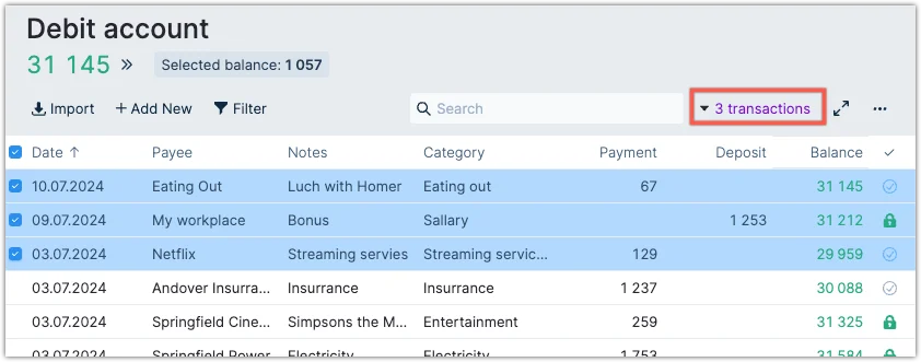 The top section also gives you access to several functions like importing transactions, manually adding new transactions, and filtering what transactions you see. On the right side you'll find the Search field which lets you quickly search all fields.